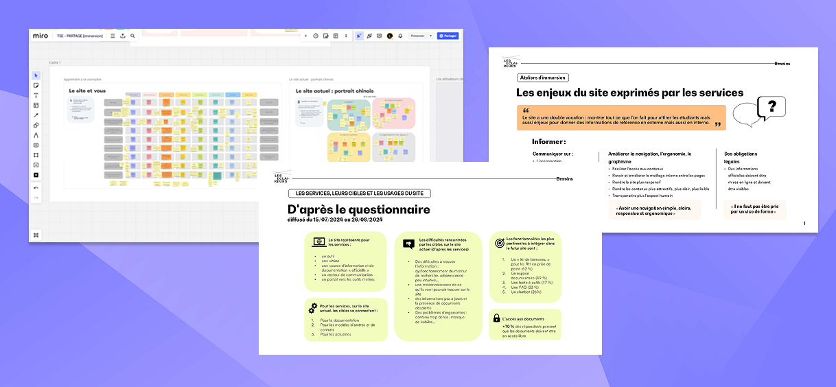 Guides d’entretien et trames de questionnaires (Typeform, Google Forms), tableaux de suivi et journal de décision, tableaux blancs collaboratifs (Miro) pour les ateliers, méthodes d’analyse (synthèse thématique, carte des besoins), matrice de priorisation en français (indispensable / utile / facultatif), dispositifs de consentement et anonymisation conformes RGPD.