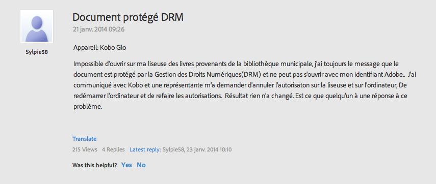 Mais que se passe-t-il quand on emprunte un eBook dans une bibliothèque ? Beaucoup de problèmes techniques en perspective comme en témoigne ce message d’un utilisateur sur le forum d’aide Adobe :