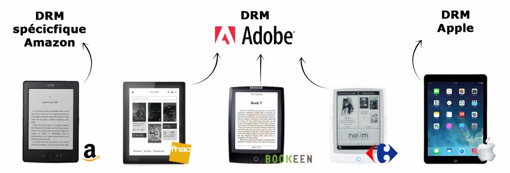 La protection la plus massivement utilisée reste le DRM spécifiquement développé par la firme Adobe qui, rappelons-le, a poussé la généralisation du format ePub pour les livres numériques, en faisant aujourd’hui un standard. Sur les 5 liseuses les plus utilisées, 3 utilisent ce type de protection. (Nous avons volontairement placé l’iPad d’Apple dans ce récapitulatif du fait de sa plateforme de livres numérique iBooks).