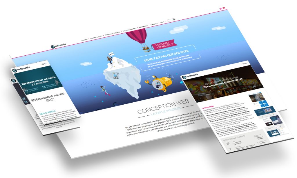 Nous avons apprécié l’atmosphère et l’ambiance qu’il a su apporter à la page d’accueil notamment par la création d’une illustration mettant en scène des personnages représentant notre équipe. Nous avons également été séduit par sa façon de travailler, la rigueur de ces fichiers Photoshop et le regard qu’il a su porter sur notre agence. Cette étape délicate a aussi été l’occasion pour tous les membres de l’équipe de s’exprimer sur le graphisme du site. Notamment notre équipe de développement a pu faire des propositions sur les maquettes et réagir à ces dernières. La validation finale des maquettes a été une décision commune de tous les membres de Netemedia.